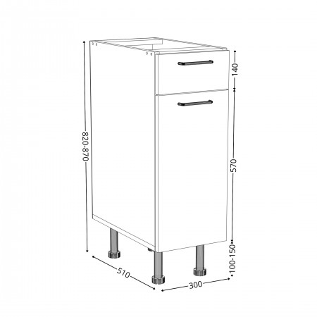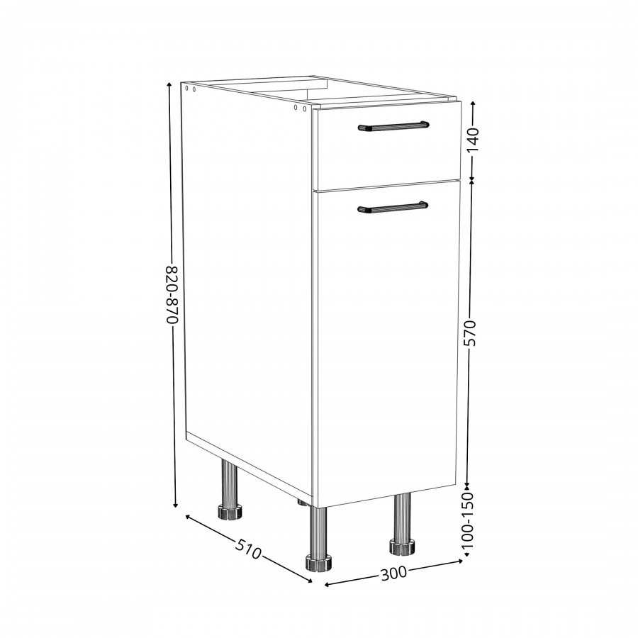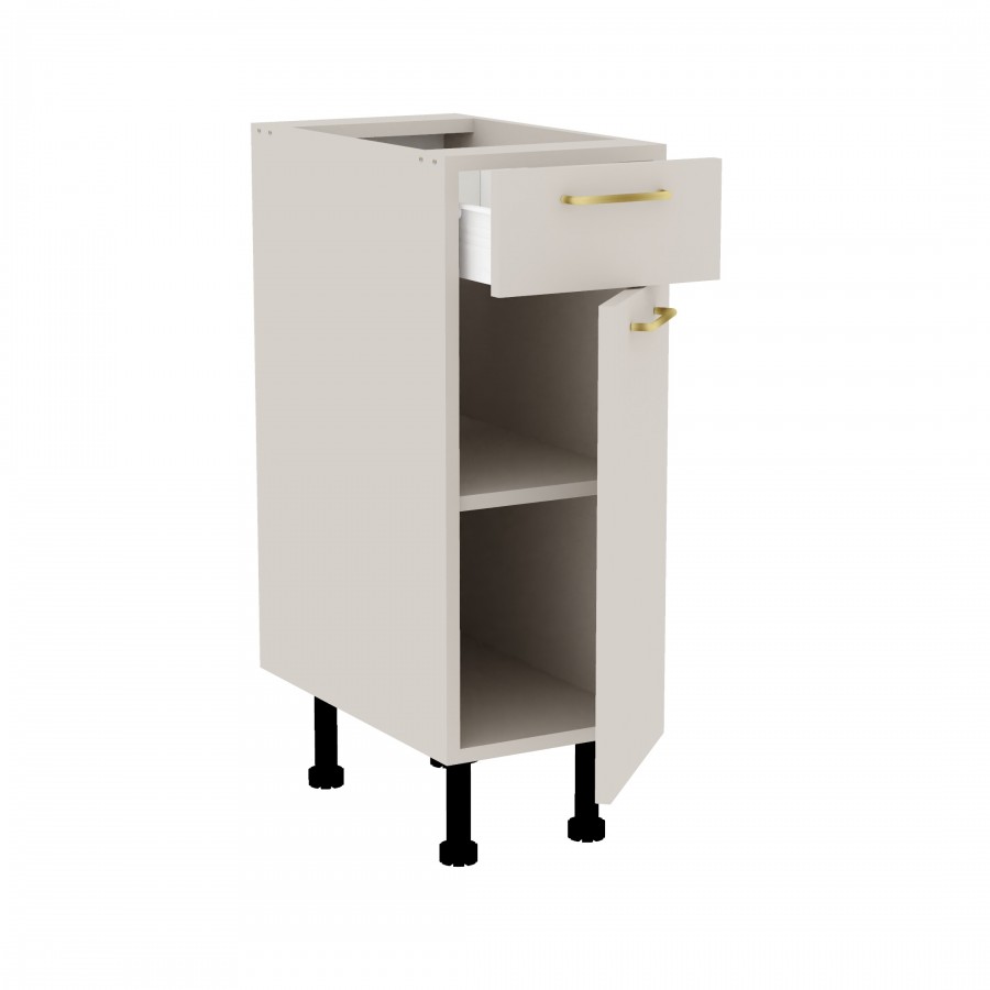 Szafka kuchenna stojąca z szufladą i półką. Korpus i fronty wykonane są z płyty laminowanej o grubości 18mm w kolorze kaszmirowym. Otwierana w prawą stronę. Posiada złote szczotkowane uchwyty.