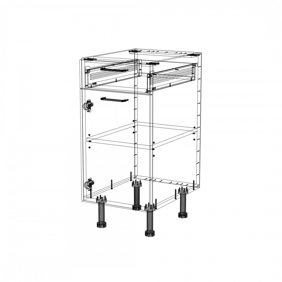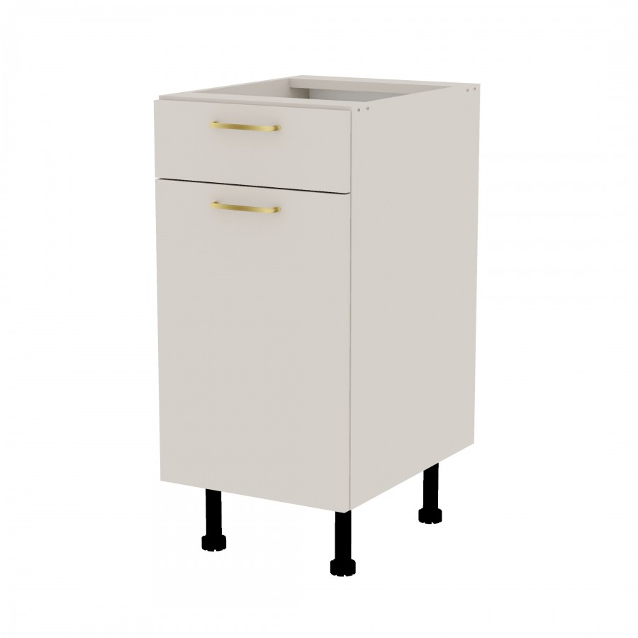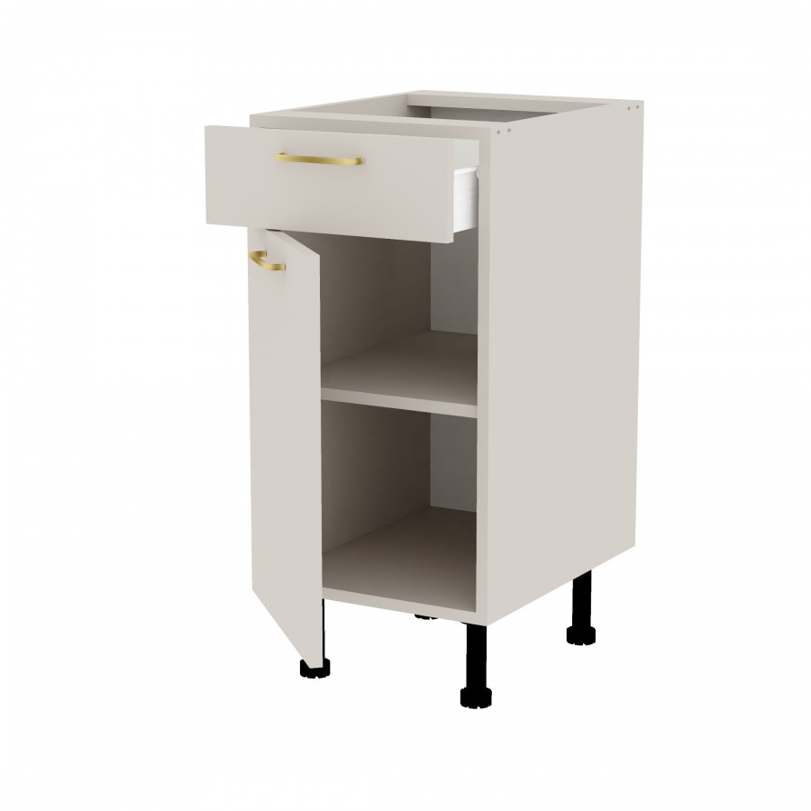 Szafka kuchenna stojąca z szufladą i półką. Korpus i fronty wykonane są z płyty laminowanej o grubości 18mm w kolorze kaszmirowym. Otwierana w lewą stronę. Posiada złote szczotkowane uchwyty.