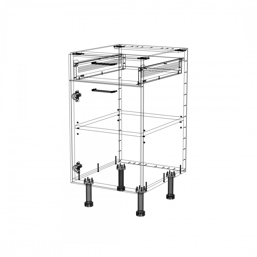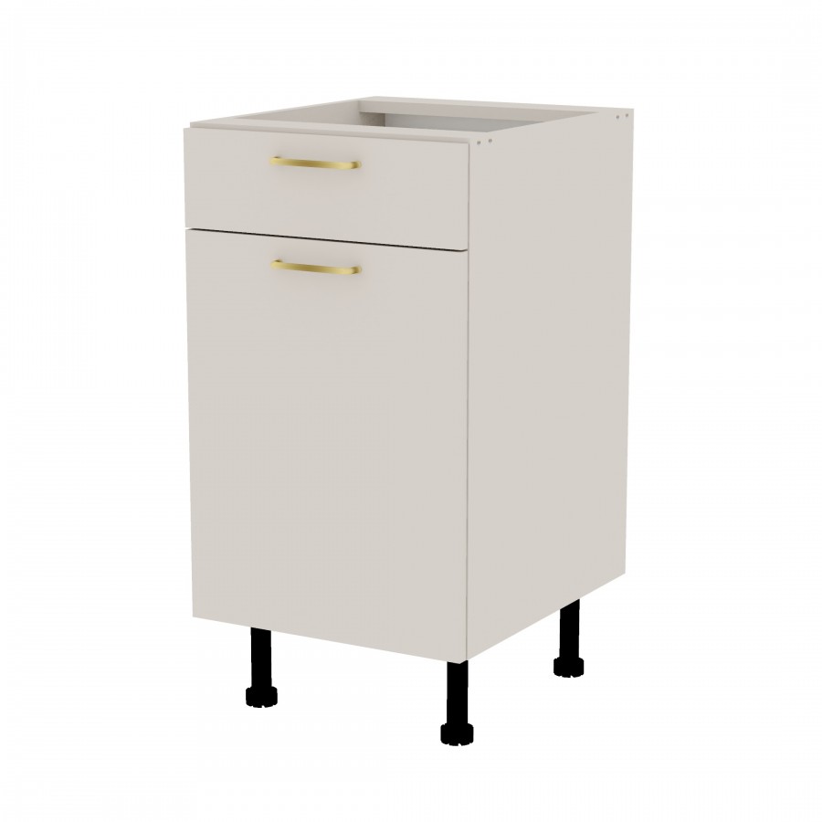 Szafka kuchenna stojąca z szufladą i półką. Korpus i fronty wykonane są z płyty laminowanej o grubości 18mm w kolorze kaszmirowym. Otwierana w lewą stronę. Posiada złote szczotkowane uchwyty.