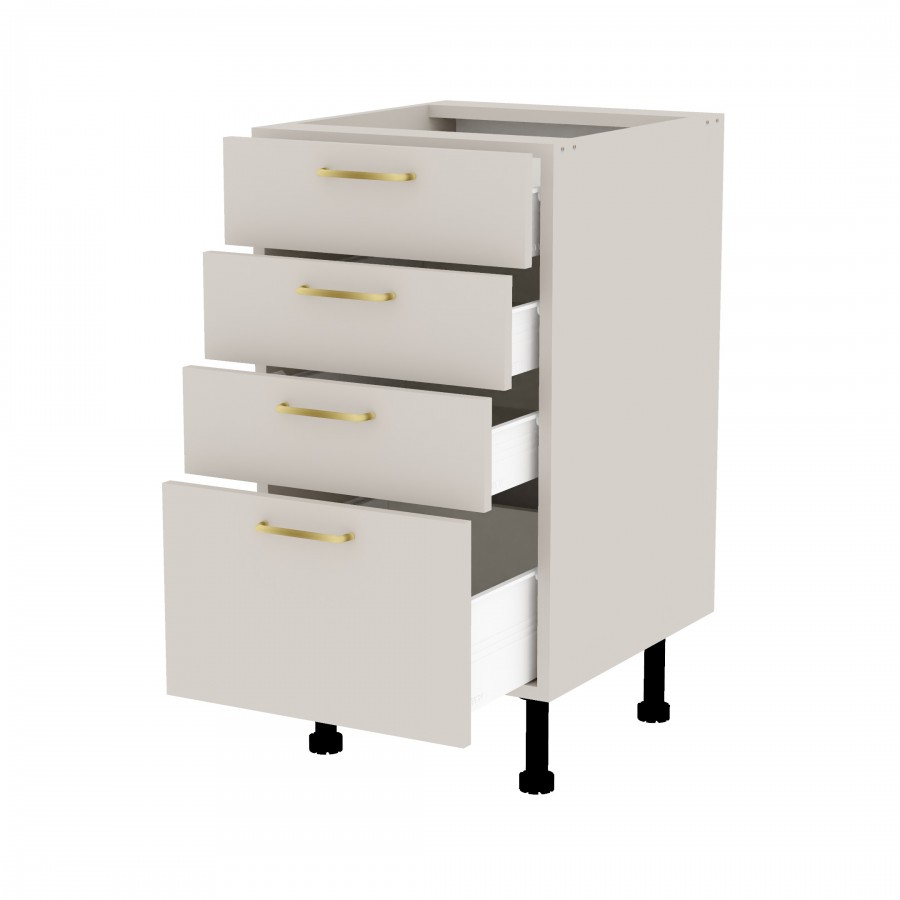 Szafka kuchenna stojąca z szufladami. Korpus i fronty wykonane są z płyty laminowanej o grubości 18mm w kolorze kaszmirowym. Posiada złote szczotkowane uchwyty.