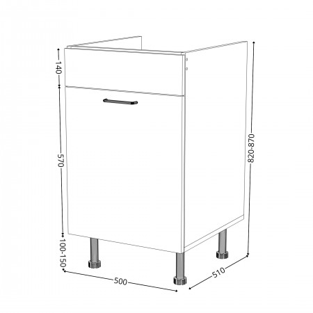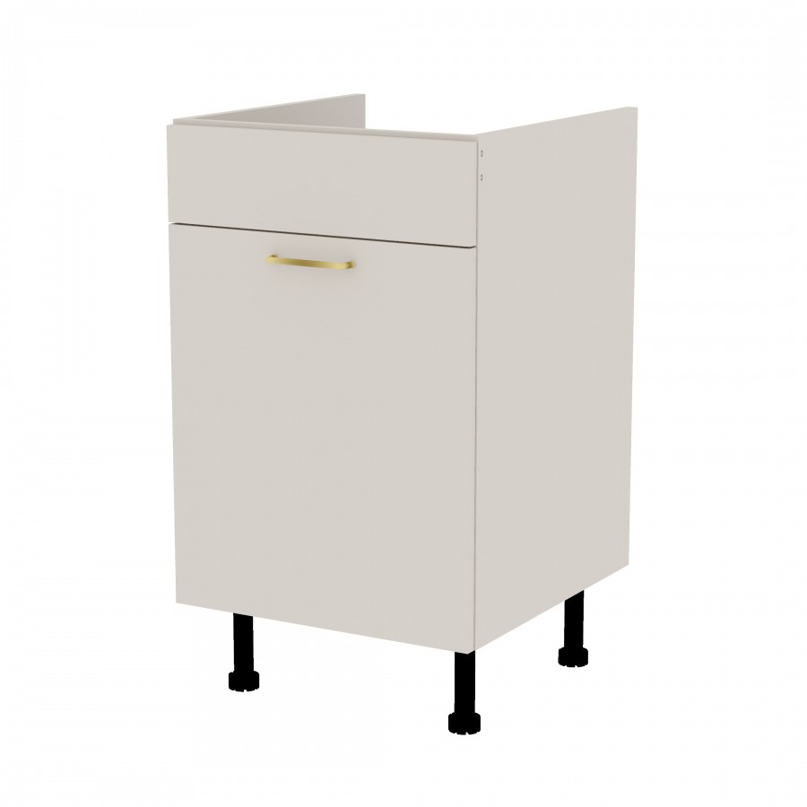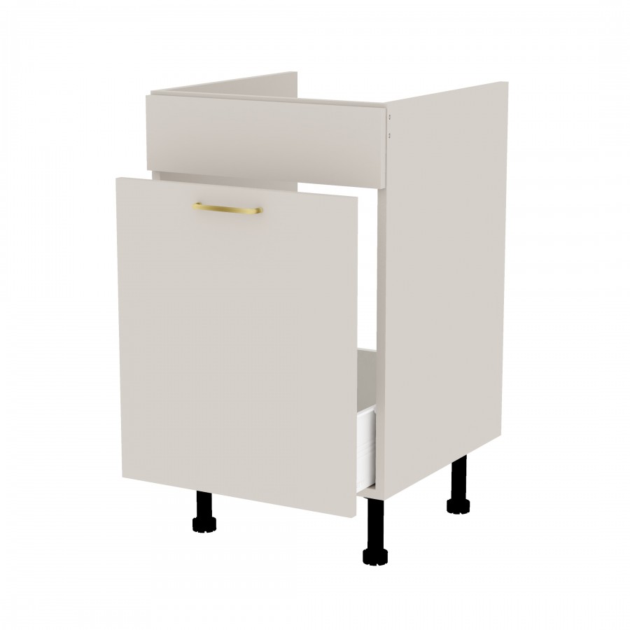 Szafka kuchenna stojąca zlewozmywakowa z szufladą. Korpus i fronty wykonane są z płyty laminowanej o grubości 18mm w kolorze kaszmirowym. Posiada złoty szczotkowany uchwyt.