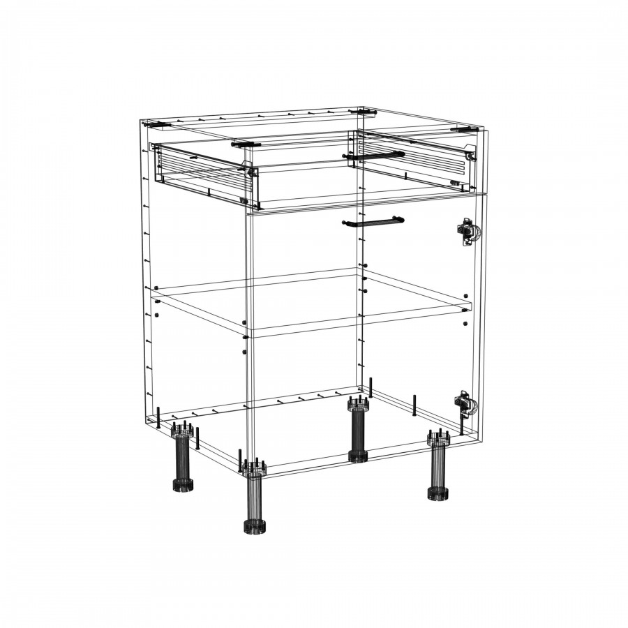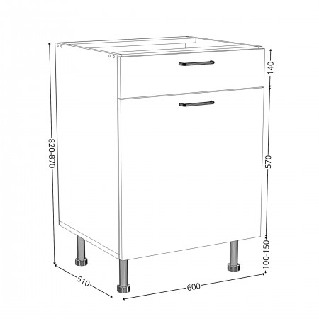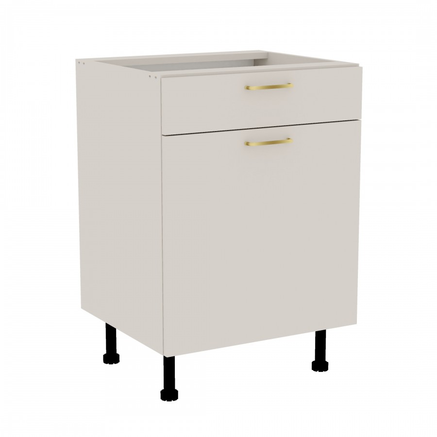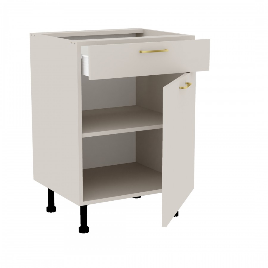 Szafka kuchenna stojąca z szufladą i półką. Korpus i fronty wykonane są z płyty laminowanej o grubości 18mm w kolorze kaszmirowym. Otwierana w prawą stronę. Posiada złote szczotkowane uchwyty.