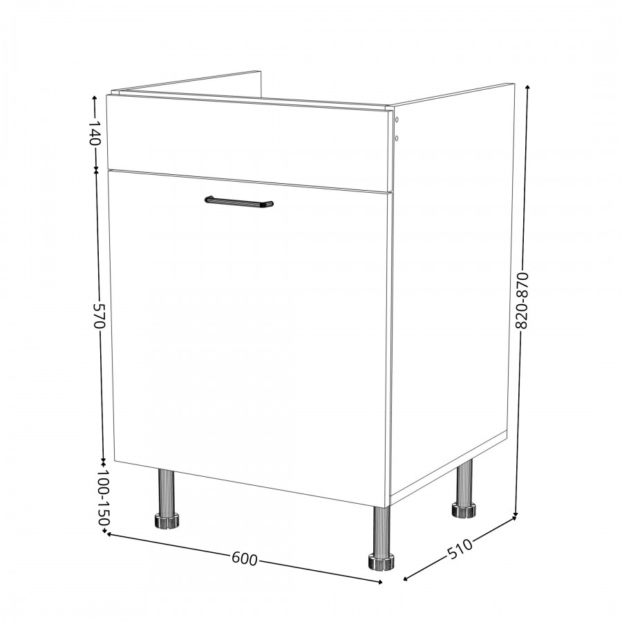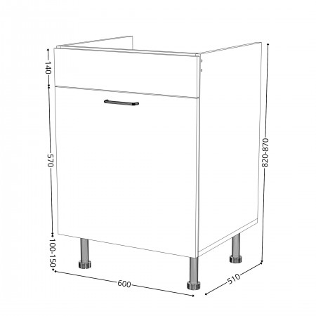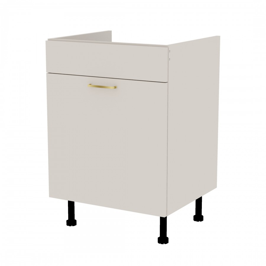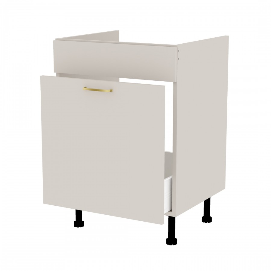 Szafka kuchenna stojąca zlewozmywakowa z szufladą. Korpus i fronty wykonane są z płyty laminowanej o grubości 18mm w kolorze kaszmirowym. Posiada złoty szczotkowany uchwyt.