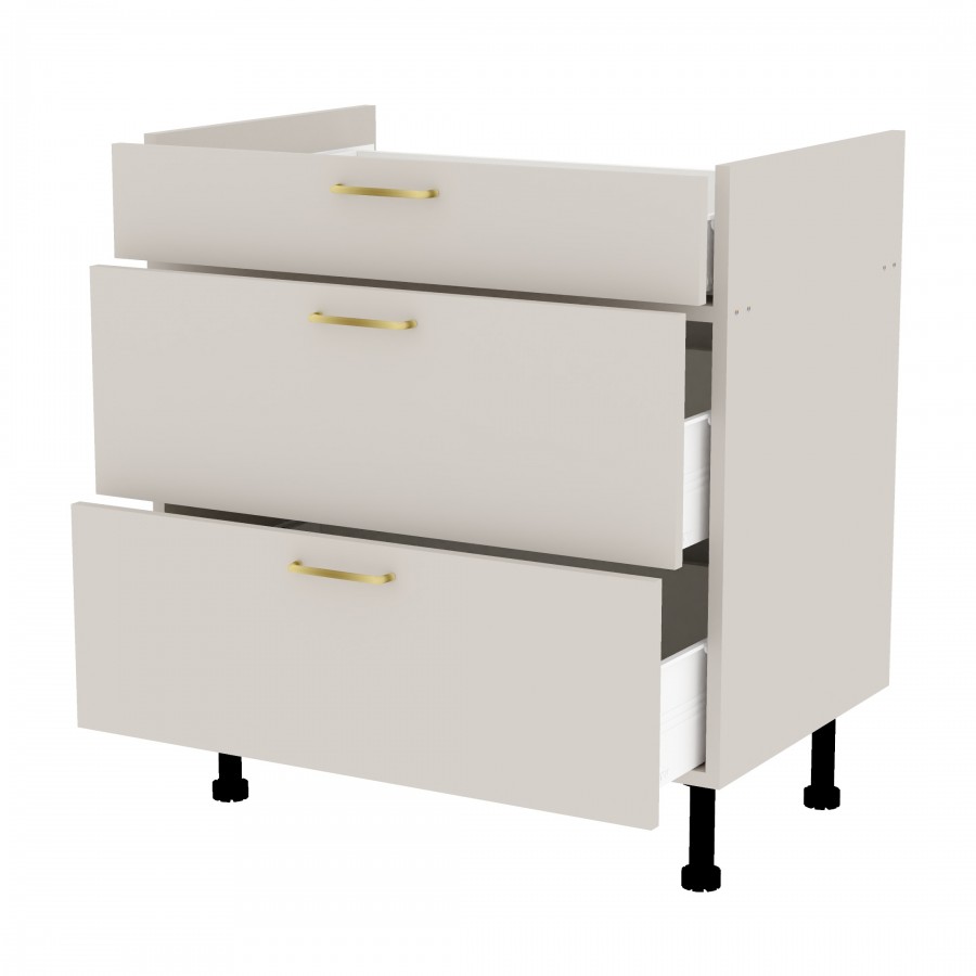 Szafka kuchenna stojąca z szufladami. Korpus i fronty wykonane są z płyty laminowanej o grubości 18mm w kolorze kaszmirowym. Posiada złote szczotkowane uchwyty.