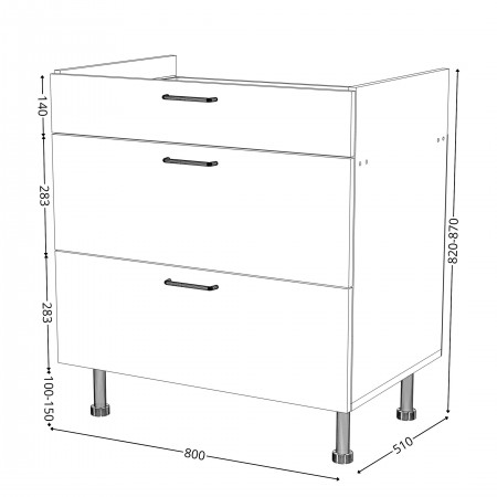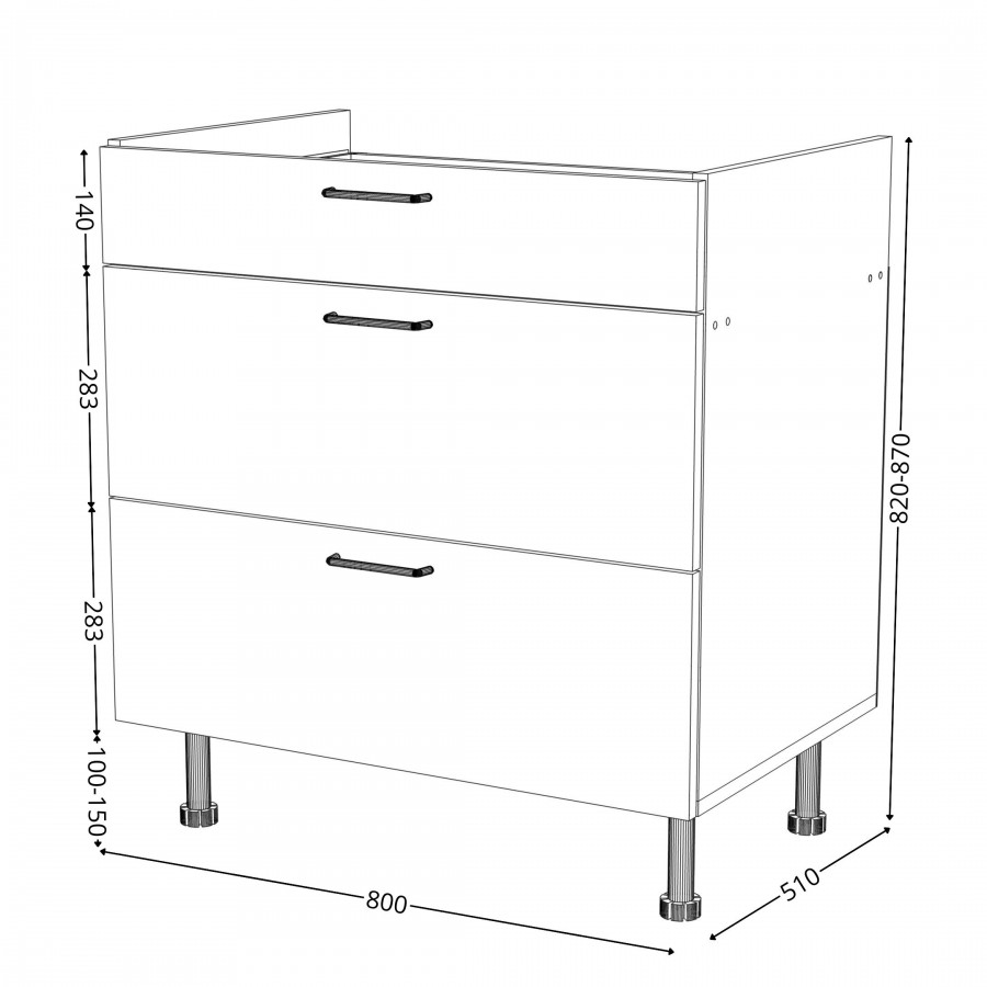 Szafka kuchenna stojąca z szufladami pod płytę grzewczą. Korpus i fronty wykonane są z płyty laminowanej o grubości 18mm w kolorze kaszmirowym. Posiada złote szczotkowane uchwyty.