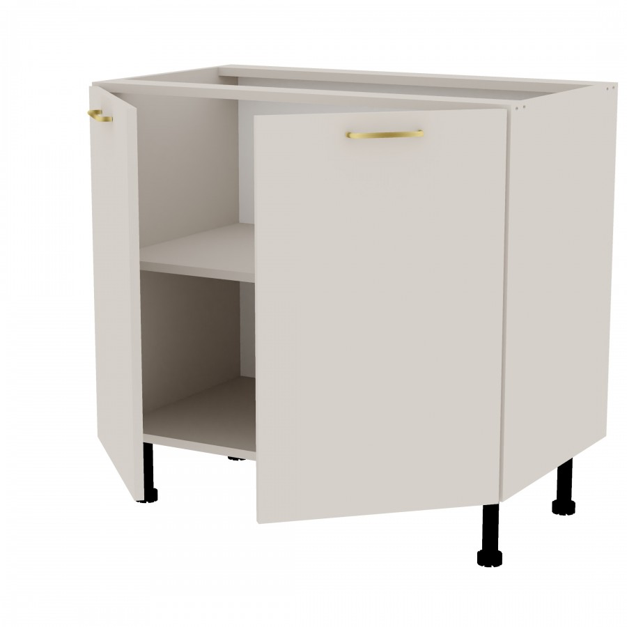 Szafka kuchenna stojąca z półką. Korpus i fronty wykonane są z płyty laminowanej o grubości 18mm w kolorze kaszmirowym. Otwierana w lewą i prawą stronę. Posiada złote szczotkowane uchwyty.