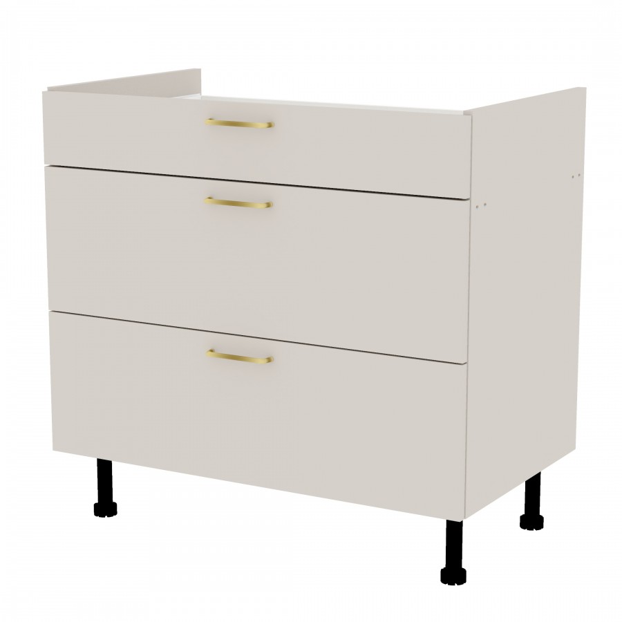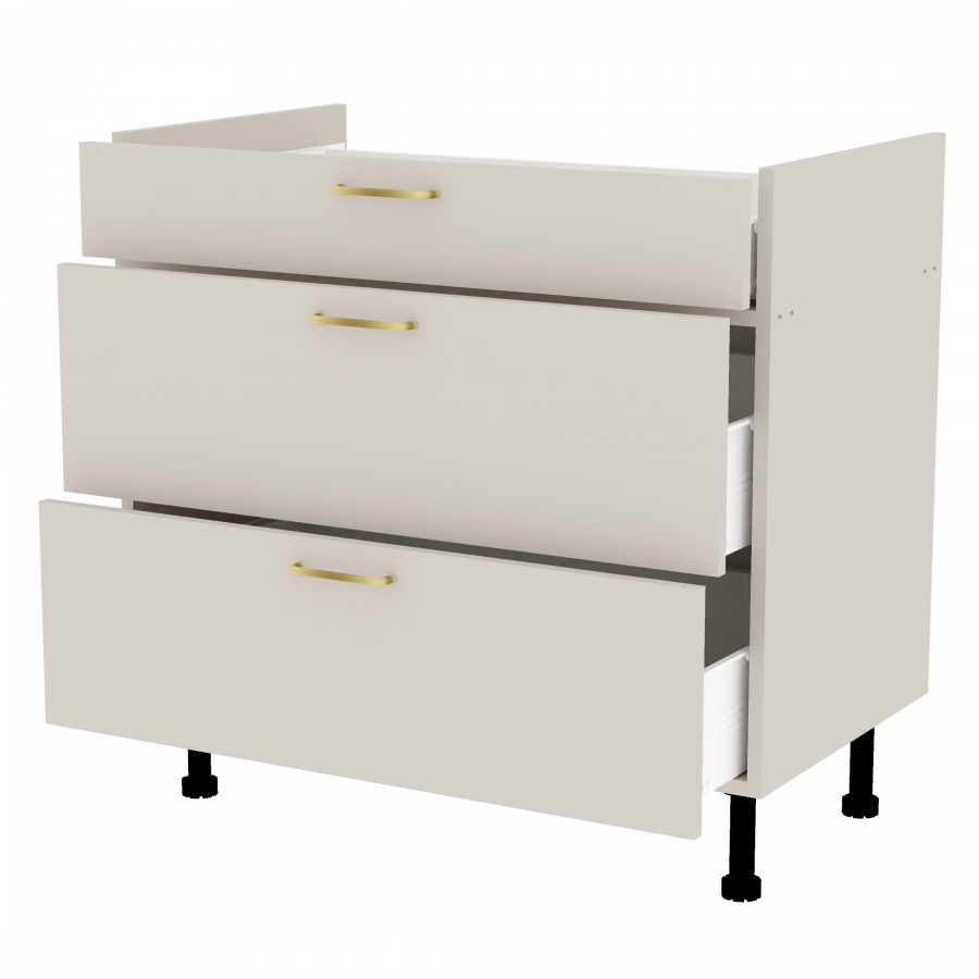 Szafka kuchenna stojąca z szufladami. Korpus i fronty wykonane są z płyty laminowanej o grubości 18mm w kolorze kaszmirowym. Posiada złote szczotkowane uchwyty.