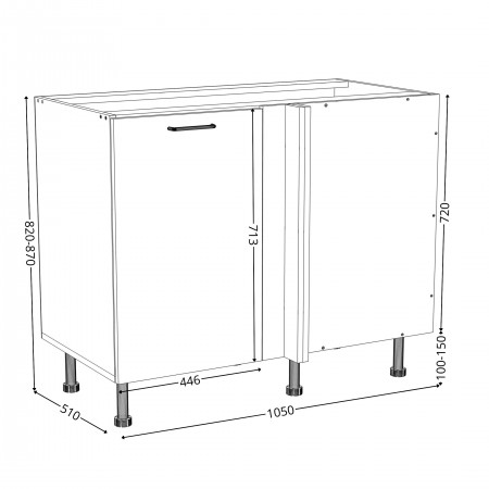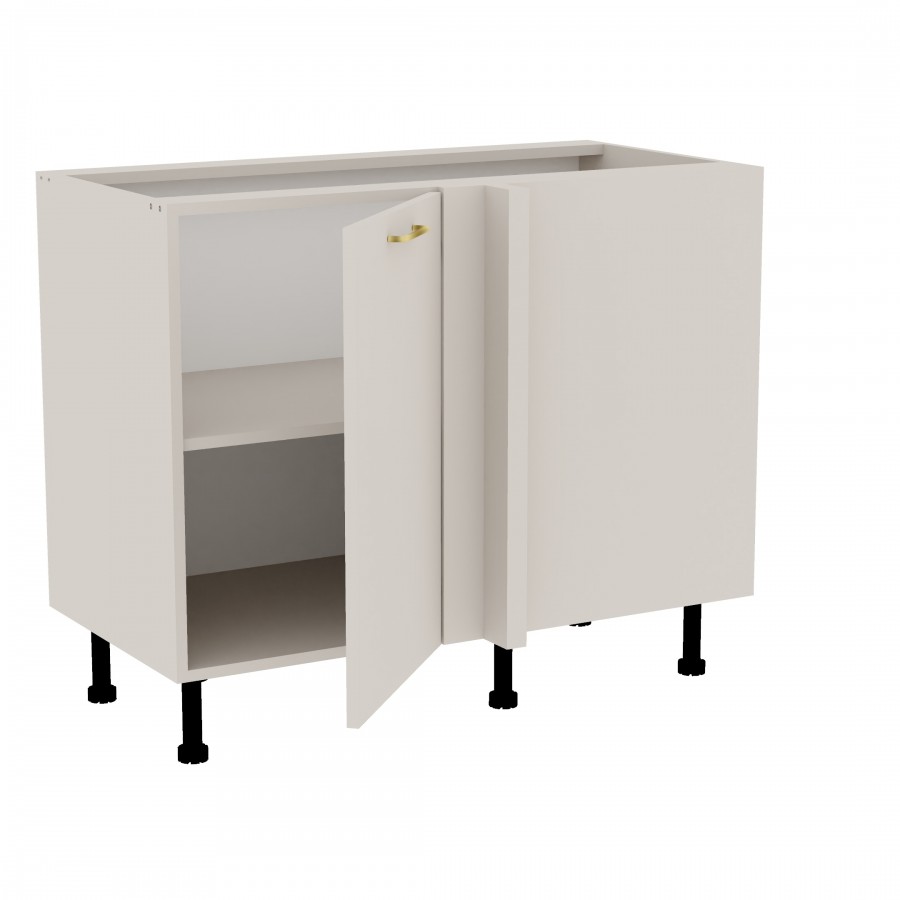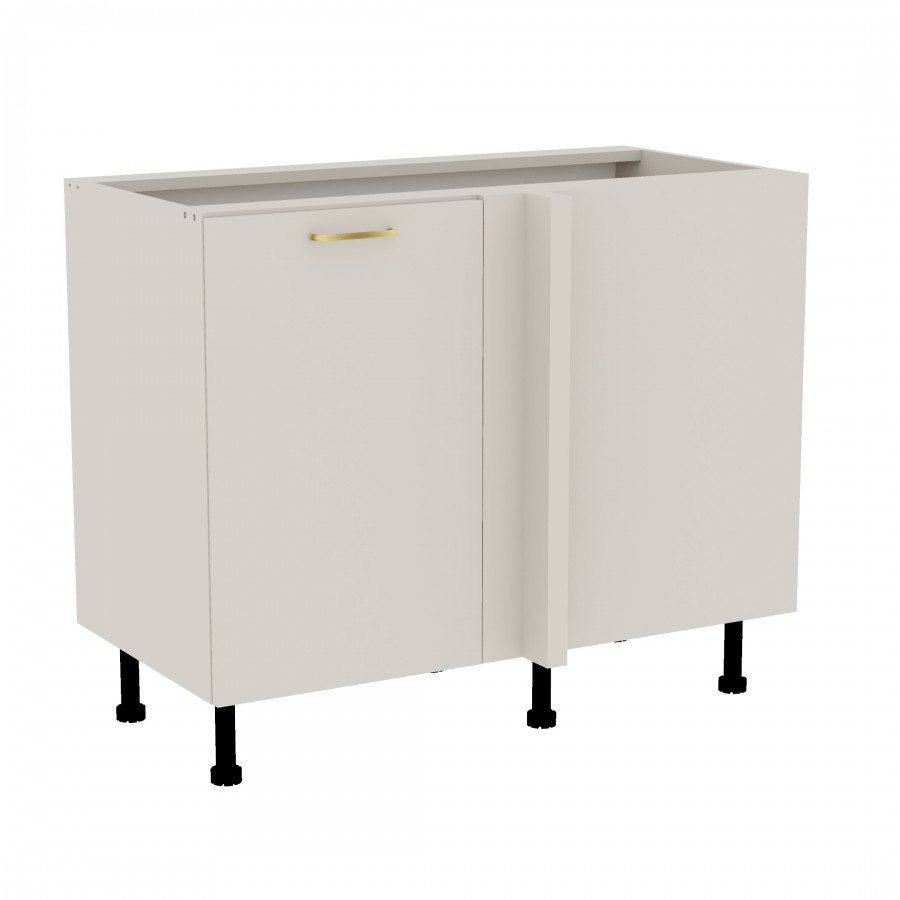 Szafka kuchenna stojąca narożna z półką. Korpus i fronty wykonane są z płyty laminowanej o grubości 18mm w kolorze kaszmirowym. Otwierana w prawą stronę. Posiada złoty szczotkowany uchwyt.