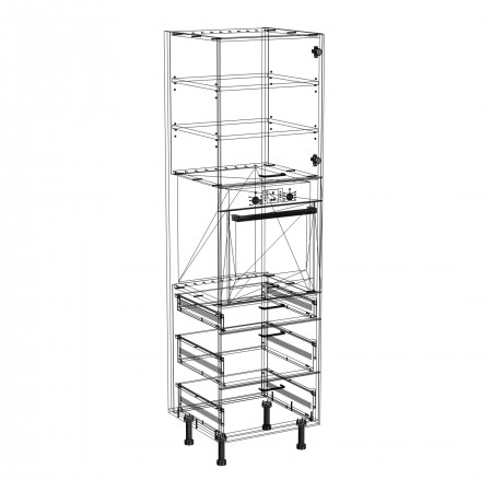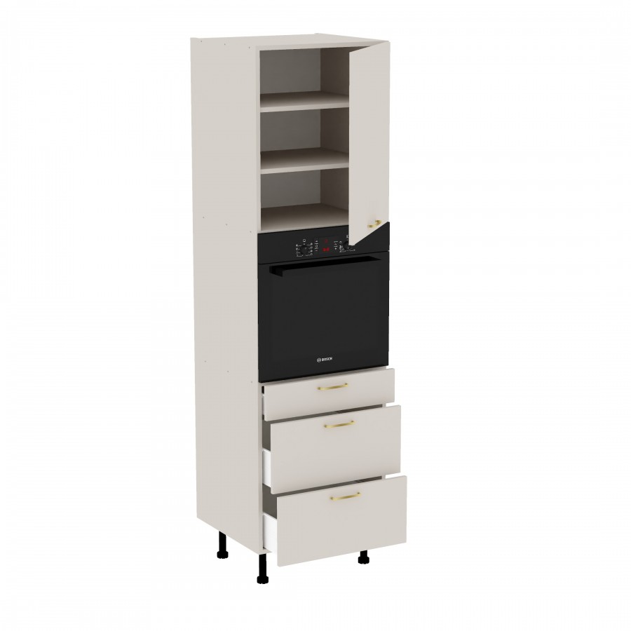 Szafka kuchenna stojąca wysoka do zabudowy piekarnika z szufladami. Korpus i fronty wykonane są z płyty laminowanej o grubości 18mm w kolorze kaszmirowym. Otwierana w prawą stronę. Posiada złote szczotkowane uchwyty.
