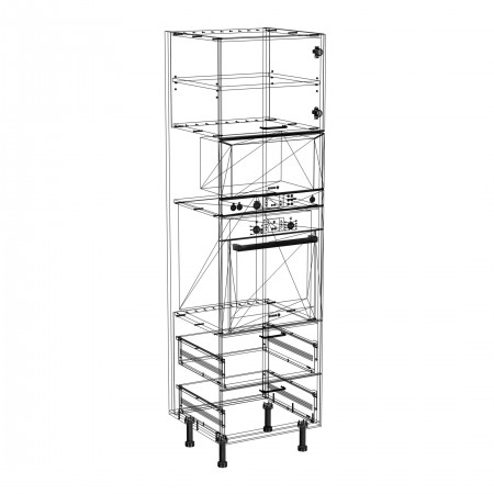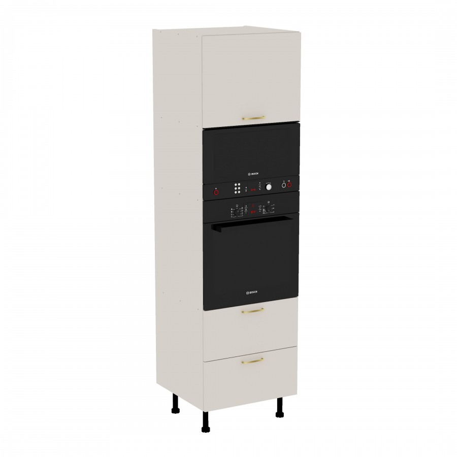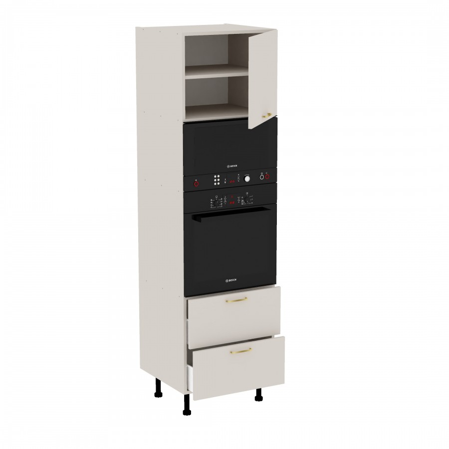 Szafka kuchenna stojąca wysoka do zabudowy piekarnika i mikrofali z szufladami. Korpus i fronty wykonane są z płyty laminowanej o grubości 18mm w kolorze kaszmirowym. Otwierana w prawą stronę. Posiada złote szczotkowane uchwyty.