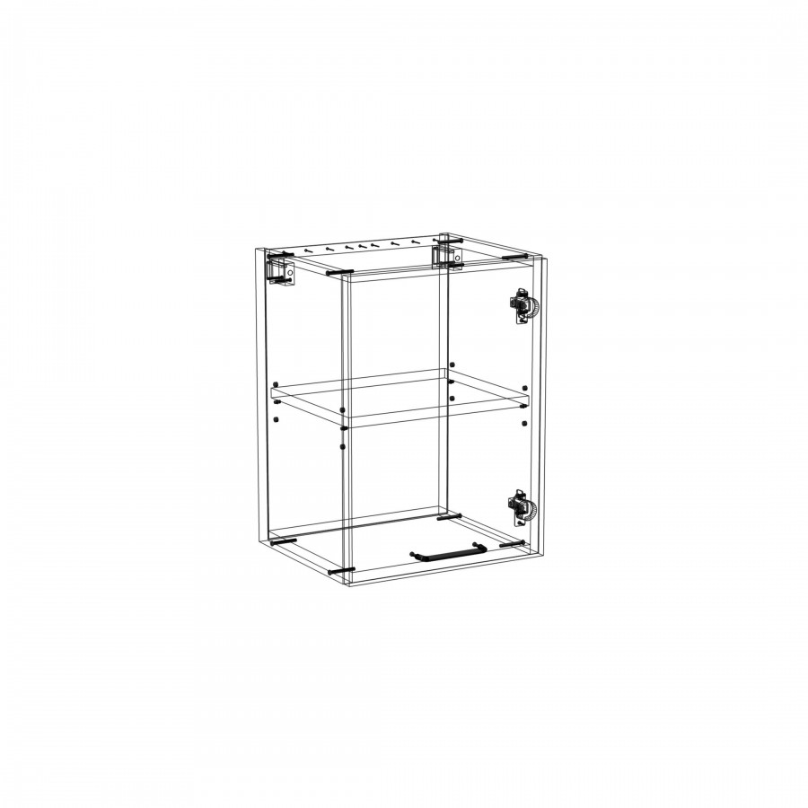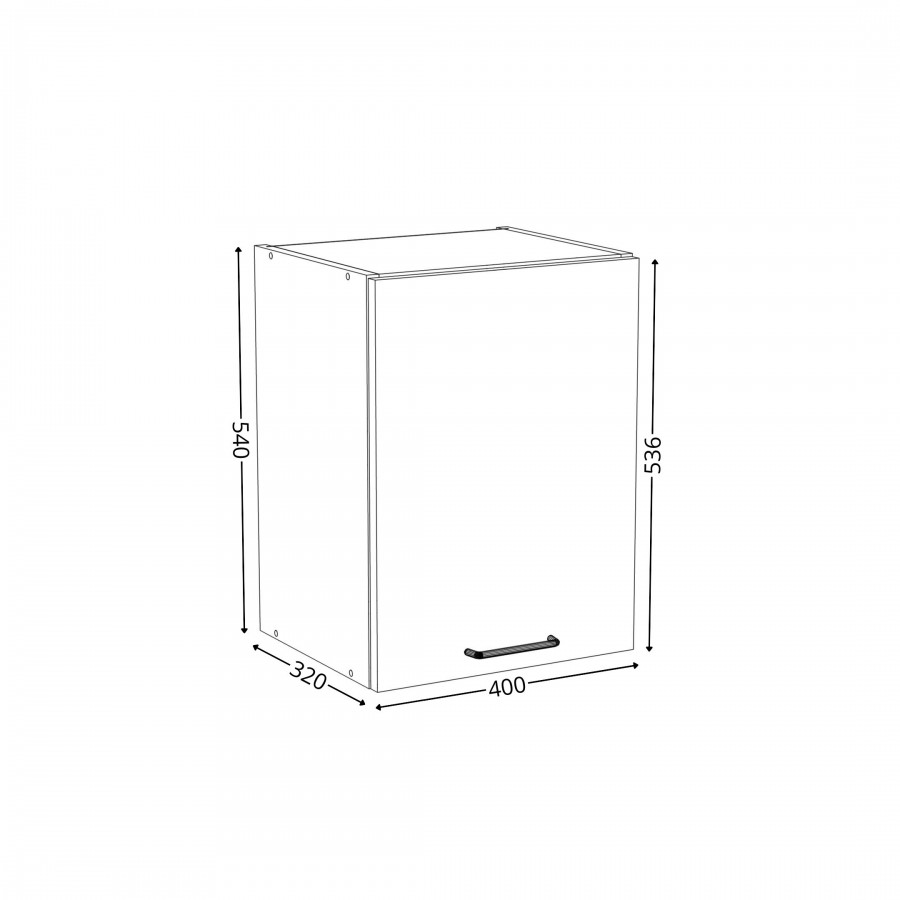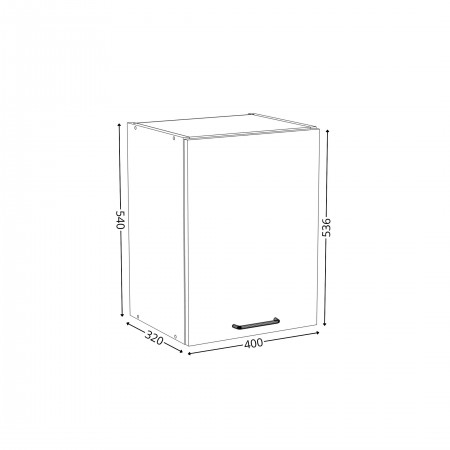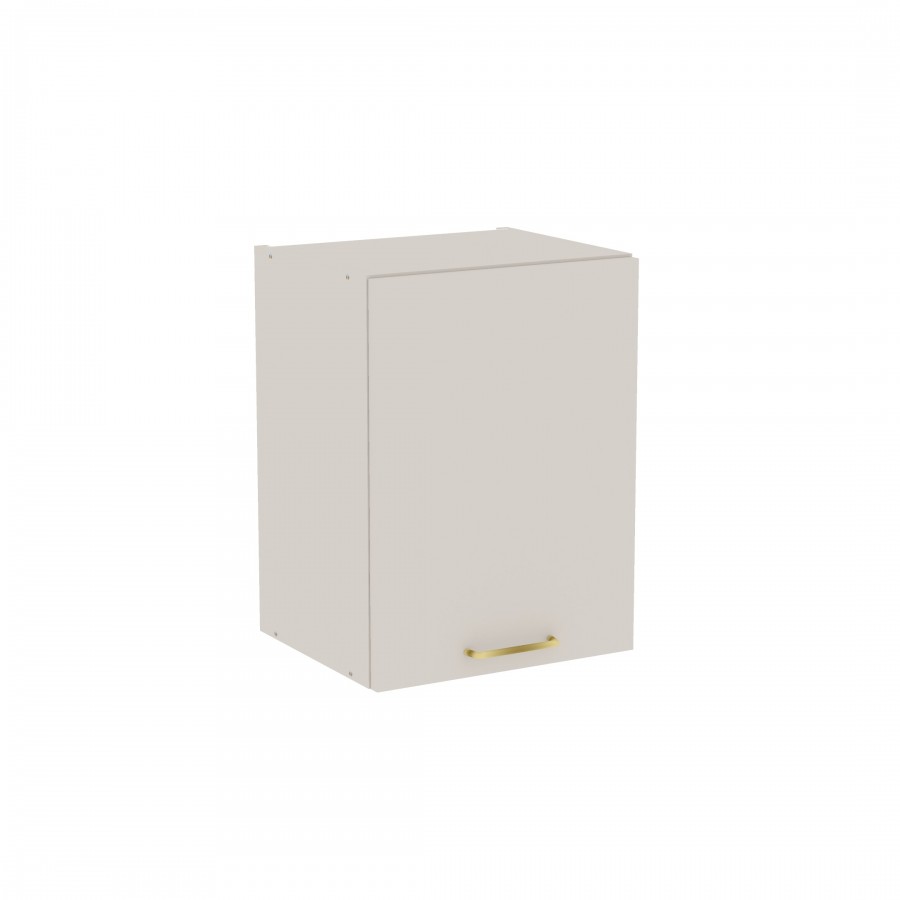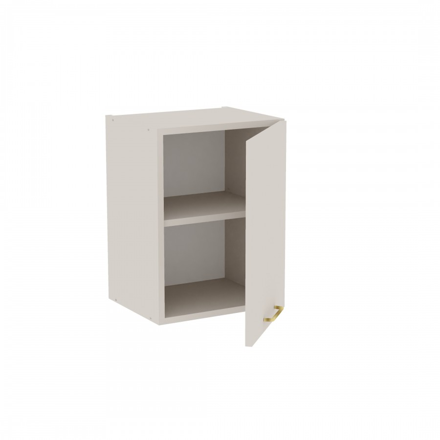 Szafka kuchenna wisząca. Korpus i front wykonane są z płyty laminowanej o grubości 18mm w kolorze kaszmirowym. Otwierana w prawą stronę. Posiada złoty szczotkowany uchwyt.