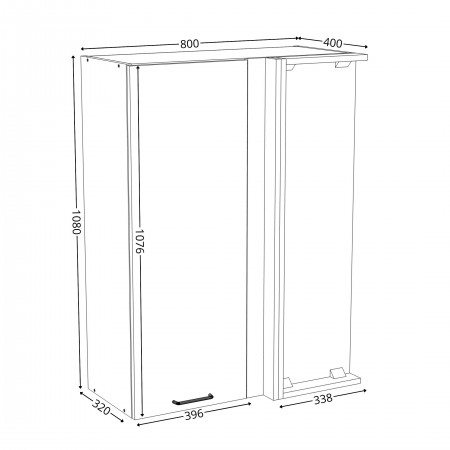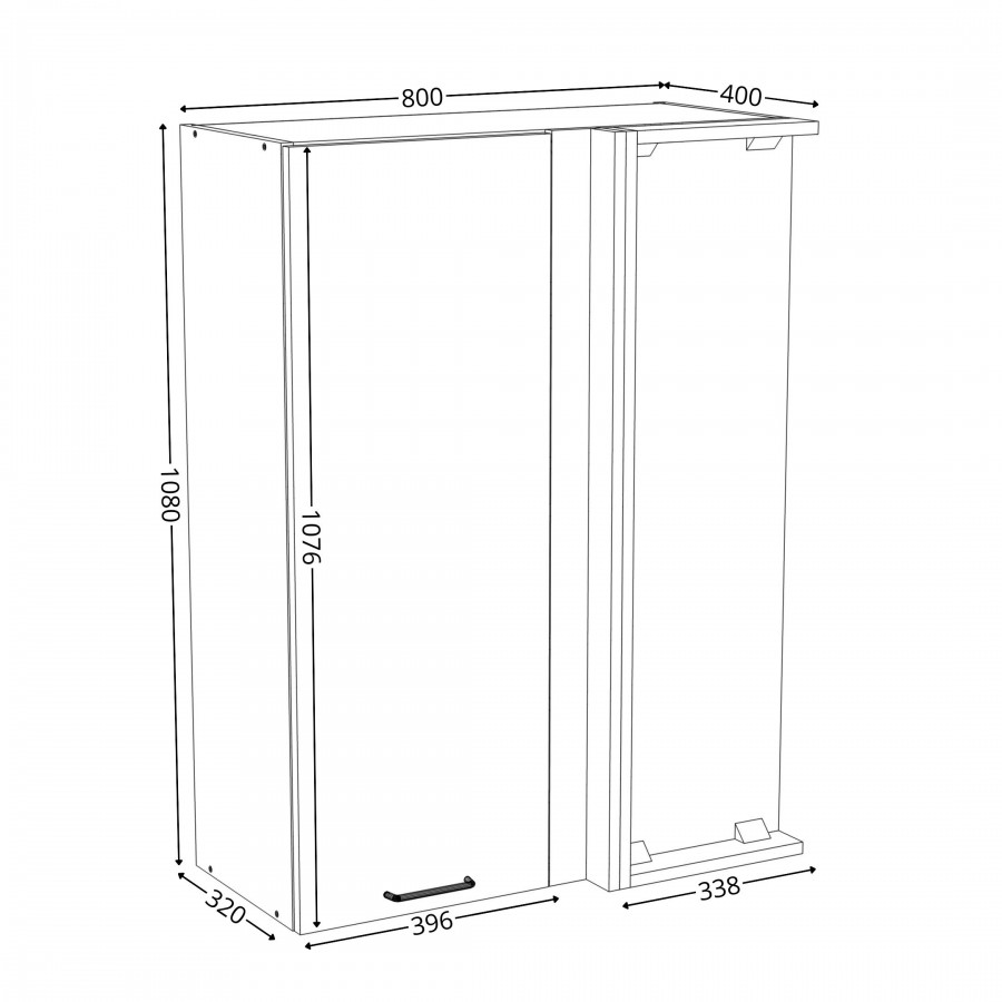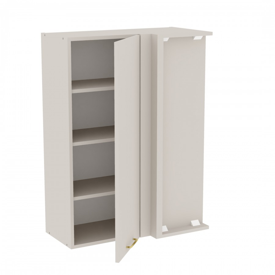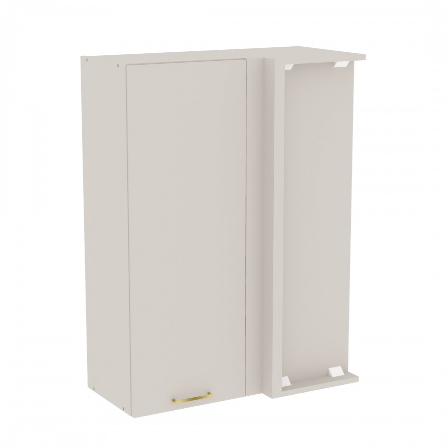 Szafka kuchenna wisząca narożna. Korpus i front wykonane są z płyty laminowanej o grubości 18mm w kolorze kaszmirowym. Otwierana w prawą stronę. Posiada złoty szczotkowany uchwyt.
