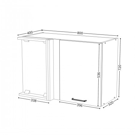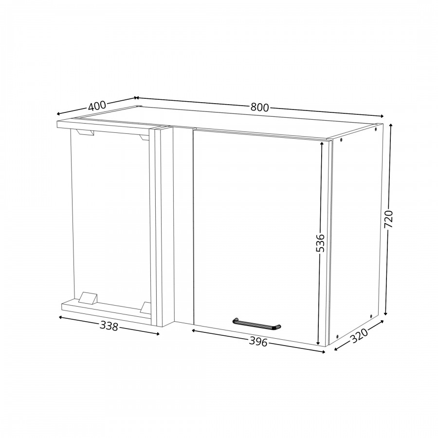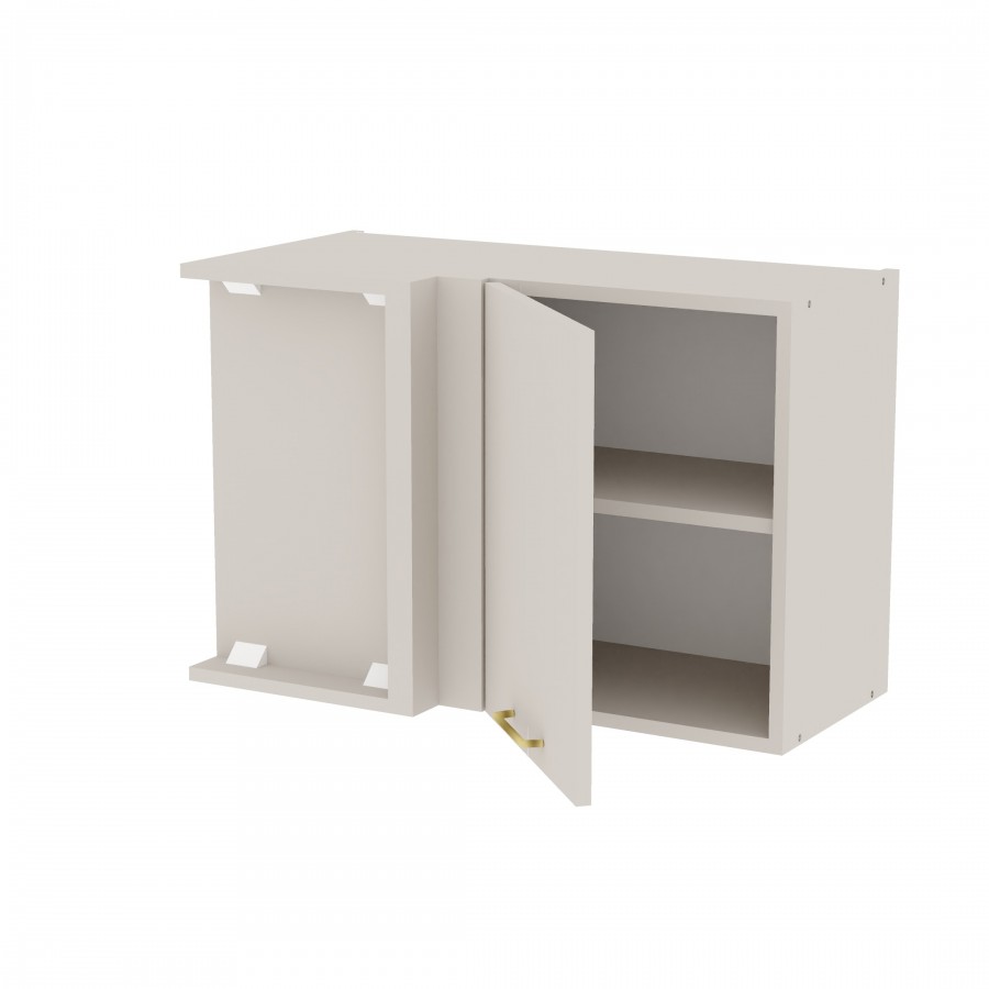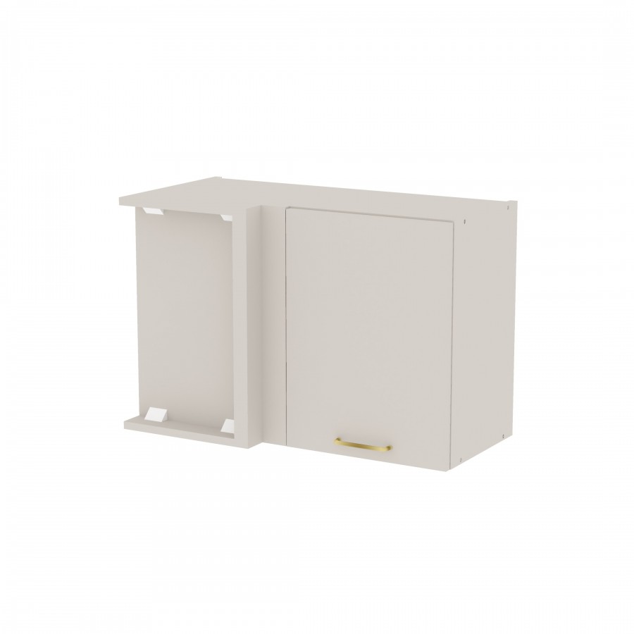 Szafka kuchenna wisząca narożna. Korpus i front wykonane są z płyty laminowanej o grubości 18mm w kolorze kaszmirowym. Otwierana w lewą stronę. Posiada złoty szczotkowany uchwyt.