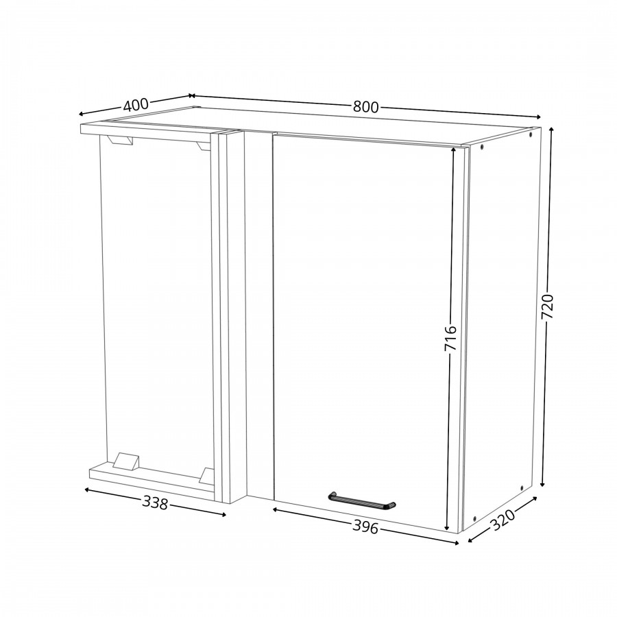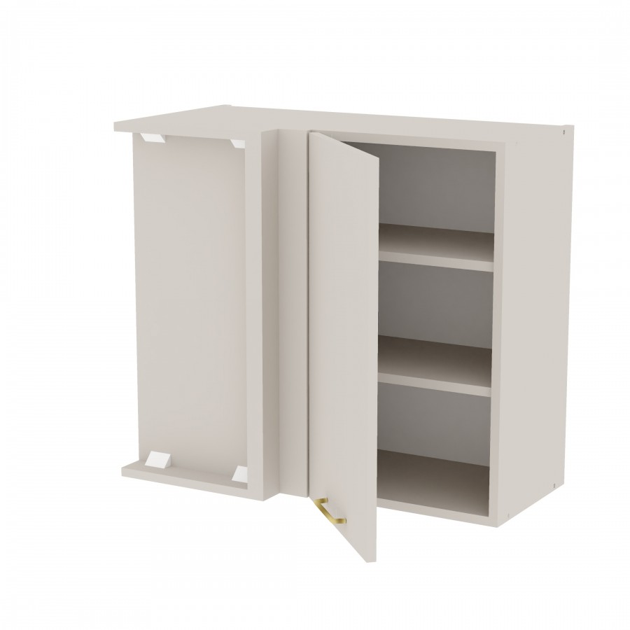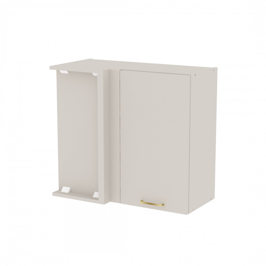 Szafka kuchenna wisząca narożna. Korpus i front wykonane są z płyty laminowanej o grubości 18mm w kolorze kaszmirowym. Otwierana w lewą stronę. Posiada złoty szczotkowany uchwyt.