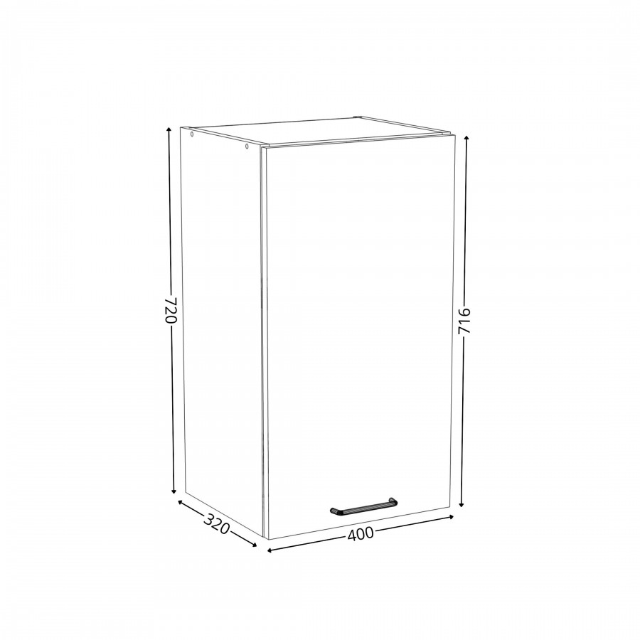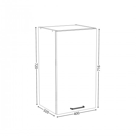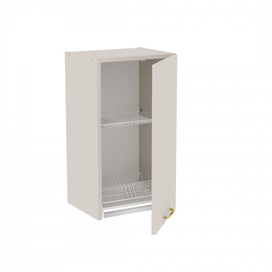 Szafka kuchenna wisząca z ociekaczem. Korpus i front wykonane są z płyty laminowanej o grubości 18mm w kolorze kaszmirowym. Otwierana w prawą stronę. Posiada złoty szczotkowany uchwyt.